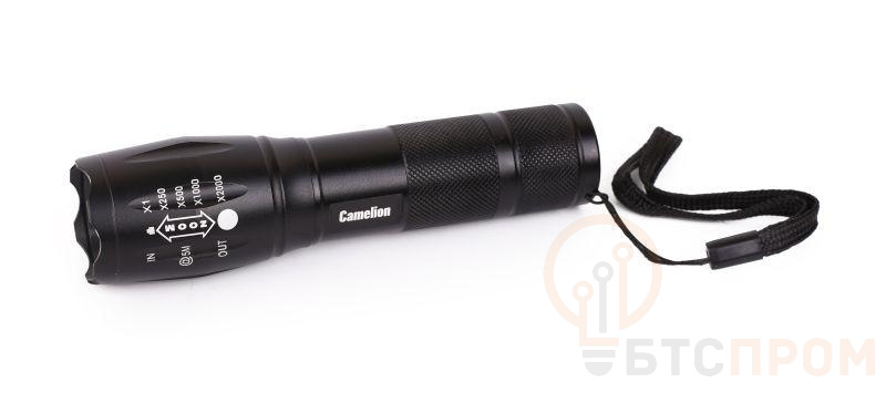 Фонарь Camelion электрический светодиодный. Цвет корпуса - черный. Работает от батареек 3xLR03 (не входят в комплект). Материал корпуса - алюминиевый сплав 6061 / Т6 с анодированным защитным покрытием. Источник света: светодиод T6 с потребляемой мощностью 3 Вт с цветовой температурой 6500К, максимальный световой поток 200 люмен. Дистанция освещения- до 200 метров. Пять режимов работы - 100% / 50% / 30% / мигающий / SOS. Универсальность использования - дальний + ближний свет, переменный фокус, регулируемый сдвигом передней части фонаря. Выключатель - пятипозиционный кнопочного типа (с защитной резиновой накладкой) в задней части фонаря. Время работы при использовании алкалиновых батареек: 100% яркости - до 1,5 ч, 50% - до 9 ч, 20% - до 13 ч, мигающий режим и SOS- более 10 ч. Комплектация: фонарь, ремешок, инструкция (внутри корпуса фонаря), упаковка. Степень пыле-влаго-защиты IP45. Упаковка: открывающийся блистер. Максимальный линейный размер фонаря 12,6 см. Размер упаковки 3 см x 8 см x 19,6 см. Вес без упаковки 0,100 кг. Вес в упаковке 0,117 кг.