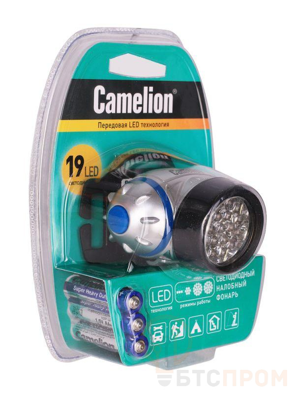 Фонарь Camelion электрический светодиодный налобный. Цвет корпуса: серебро + чёрный. Работает от 3 X AAA батареек (входят в комплект). Материал корпуса - пластик. Источник света - 19 светодиодов с рассеивающими линзами с цветовой температурой 6500К, со световым потоком 48 люмен. Дистанция освещения - до 25 метров. Четыре режима работы. Выключатель -четырёхпозиционный кнопочного типа. Время работы при использовании солевых батареек: 3 светодиода - до 35 часов, 7 светодиодов - до 25 часов, 19 светодиодов - до 14 часов, 19 светодиодов в мигающем режиме - до 70 часов. Комплектация: фонарь, батарейки 3 x R03 Camelion Super Heavy Duty, эластичный ремешок для ношения на голове, поворотный отражатель, упаковка. Степень пыле-влаго-защиты IP44. Упаковка - двойной блистер. Максимальный линейный размер фонаря 6,8 см. Размер упаковки 7 см x 11 см x 15 см. Вес без упаковки 0,07 кг. Вес с упаковкой и батарейками 0,136 кг.