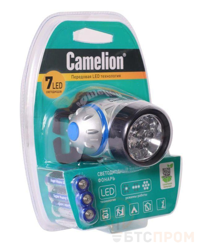 Фонарь Camelion электрический светодиодный налобный. Цвет корпуса: серебро + чёрный. Работает от 3 X AAA батареек (входят в комплект). Материал корпуса - пластик. Источник света - 7 светодиодов с рассеивающими линзами с цветовой температурой 6500К, со световым потоком 20 люмен. Дистанция освещения - до 20 метров. Три режима работы. Выключатель - трехпозиционный кнопочного типа. Время работы при использовании солевых батареек: 1 светодиод - до 70 часов, 3 светодиода - до 35 часов, 7 светодиодов - до 25 часов. Комплектация: фонарь, батарейки 3 x R03 Camelion Super Heavy Duty, эластичный ремешок для ношения на голове, поворотный отражатель, упаковка. Степень пыле-влаго-защиты IP44. Упаковка - двойной блистер. Максимальный линейный размер фонаря 6,8 см. Размер упаковки 7 см x 11 см x 15 см. Вес без упаковки 0,07 кг. Вес с упаковкой и батарейками 0,136 кг.