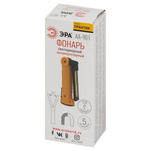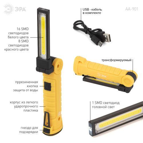 ЭРА AA-901 – многофункциональный светодиодный фонарь-трансформер с поворотной на 360° LED-платой. Оснащён 3 типами креплений: магнит, клипса, крючок. Имеет встроенный аккумулятор, подзаряжается при помощи USB-кабеля (в комплекте). Одного полного заряда хватает на 5 часов непрерывной работы. Степень защиты фонаря от влаги и пыли – IP44. Фонарь комфортен в применении: корпус из легкого ударопрочного пластика, прорезиненная кнопка включения, гнездо для зарядки защищено резиновой заглушкой. LED-плата объединяет светодиоды белого и красного цвета (16 SMD + 8 SMD). Она создает широкое заливающее освещение. Световой поток – 380 Лм. В головной части фонаря установлен светодиод 3 Вт с дальним направленным лучом. Дальность света – 15 м. В зависимости от задач можно выбирать любой из 5 режимов освещения: разные варианты яркости (100 и 50%), статичный красный или динамичный красный свет, головной свет.