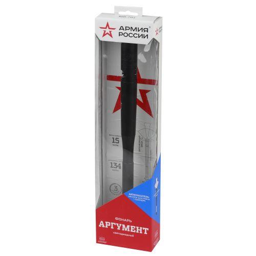 ЭРА Армия России Аргумент - мощный фонарь-автоспасатель со стропорезом и молотком для стекла. Один из самых необычных фонарей на современном рынке. Представитель уникальной совместной серии бренда ЭРА и АО "Военторг" (действующего на основе лицензии Министерства обороны РФ), этот яркий качественный фонарь снабжён стропорезом и молотком для стекла. Такой функционал позволяет использовать его как автоспасатель. Актуальный практичный гаджет, который должен быть в автомобиле каждого мужчины. Особая конструкция и прочность корпуса позволяют применять ЭРА Армия России Аргумент для самозащиты. Фонарь упакован в картонную подарочную коробку в узнаваемой стилистике бренда "Армия России". Фирменная звезда "Армия России" - и на корпусе самого фонаря. Высокое качество освещения: сверхдальность (134 метра), оптимальный световой поток (200 лм), регулируемый фокус (дальний направленный, средний и ближний заливающий свет). Фонарь ЭРА Армия России Аргумент работает от 4 пальчиковых батареек - это 15 часов качественного света. Благодаря эргономичной конструкции, его удобно и приятно держать в руках.