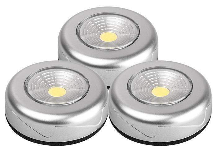 Универсальные фонари-светильники ПУШЛАЙТ (включается нажатием) COB светодиод яркостью 50 люмен Цветовая температура светодиода 7500К Не требует прокладки проводов Легко устанавливается на любой поверхности Двусторонний скотч в комплекте Класс пылевлагозащиты IP20