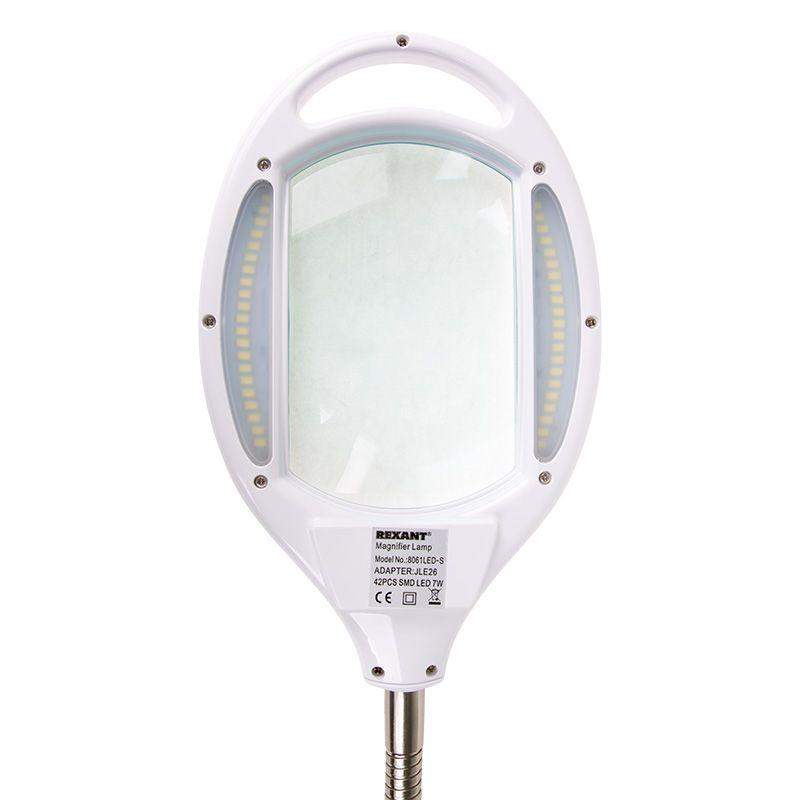 Лупа напольная 3D с подсветкой 42 LED, белая REXANT имеет широкий спектр применения. Используется в косметологии, ногтевом сервисе, ювелирном деле и т.д. Предназначена для визуального увеличения различных мелких деталей или предметов. Подходит для выполнения различных работ, где необходима высокая точность и безопасность. Стеклянная линза размером 174х108мм обеспечивает четкое изображение. Устойчивая напольная конструкция имеет возможность регулировки угла наклона и высоты линзы. Бестеневая подсветка позволяет работать в улучшенных условиях. В лампу встроен специальный электронный блок управления, благодаря которому излучается ровный свет без мерцания. Держатель линзы оснащен рукояткой, посредством которой можно настраивать положение линзы, не дотрагиваясь до самой линзы. Устройство экономично в энергопотреблении.