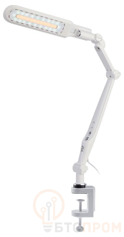 Настольный светильник ЭРА NLED-496-12W-W со светодиодами (LED) в качестве источников света. Оснащен сенсорным управлением с возможностью выбора цветовой температуры (теплый, нейтральный или холодный свет). Плавный диммер для регулировки яркости. Светильник сохраняет выбранные настройки при включении-выключении. Высота плафона регулируется двухсекционной сгибающейся стойкой, направление света регулируется поворотом и наклоном плафона в любую сторону. Удобное крепление на струбцину.