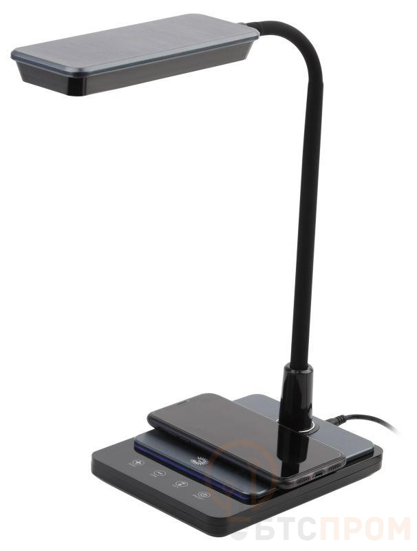 Настольный светильник ЭРА NLED-499-10W-BK со светодиодами (LED) в качестве источников света. Оснащен сенсорным управлением с возможностью выбора цветовой температуры (теплый, нейтральный или холодный свет). Плавный диммер для регулировки яркости. Светильник сохраняет выбранные настройки при включении-выключении. Направление света регулируется наклоном и поворотом плафона в любом направлении. Светильник имеет встроенный модуль Qi для беспроводной зарядки мобильных устройств. Просто положите телефон, поддерживающий функцию Qi, на основание светильника в отмеченной зоне - светильник подзарядит его удобно и быстро!