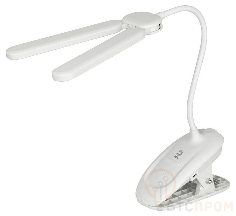 Настольный светильник ЭРА NLED-512-6W-W со светодиодами (LED) в качестве источников света, с сенсорным управлением, возможностью выбора цветовой температуры и плавным диммером для регулировки яркости. Модель на прищепке, которая обеспечивает надежную фиксацию на выступающих поверхностях. Встроенный литиевый аккумулятор для автономной работы. Подзарядка от USB. USB-кабель в комплекте. Гибкая стойка и двойной плафон (из двух отдельных частей) позволяют выбирать наиболее комфортное направление света.