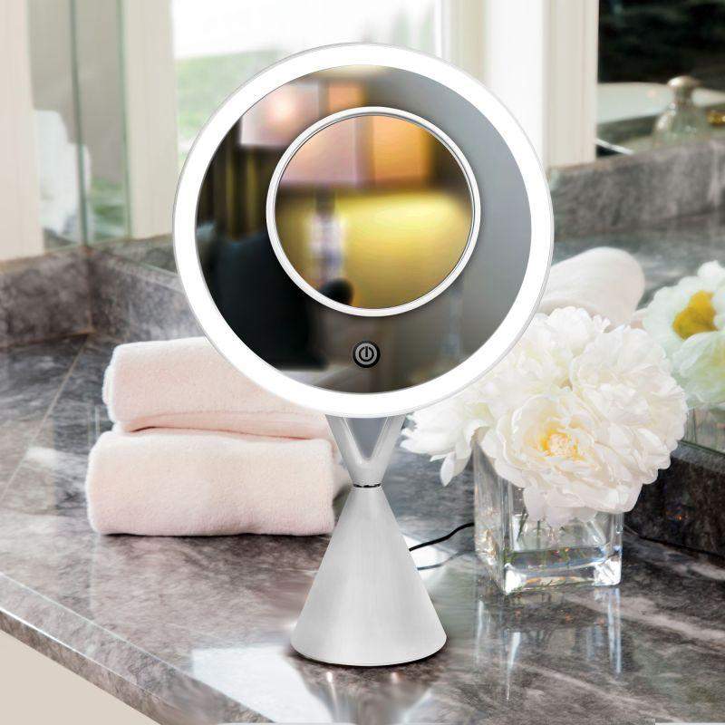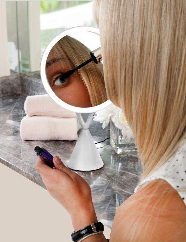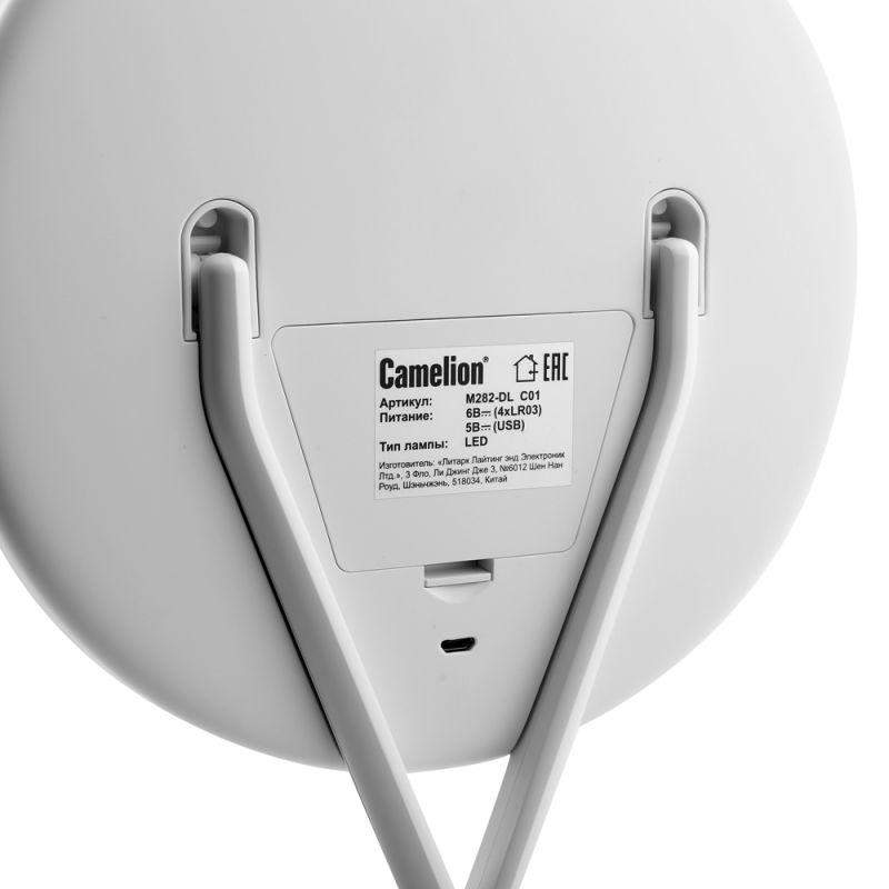 Зеркало для макияжа со светодиодной подсветкой Camelion, макияжа, гримерования, проведения различных медицинских процедур в области лица. Camelion M282-DL C01, цвет белый, мощность 5Вт, питание - 4*LR03 (ААА) / USB, в комплект не входят, кол-во светодиодов - 30, дневной свет, увеличение 5х, в комплекте - зеркало на подставке, зеркало увеличительное на магните, инструкция, провод питания USB 1м
