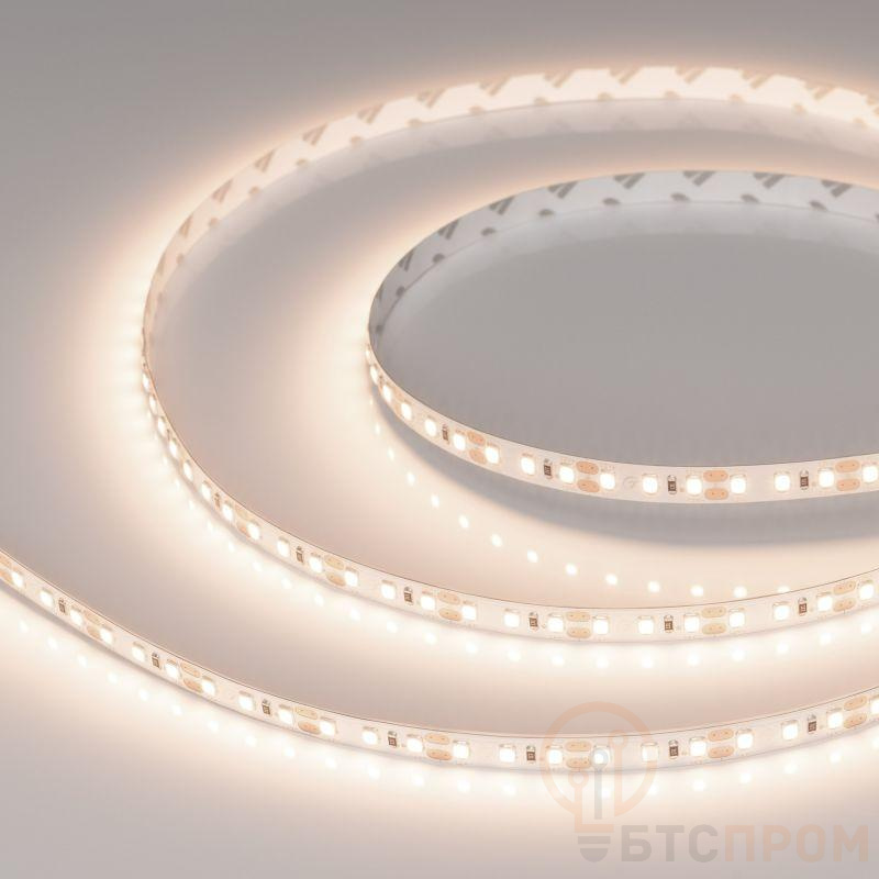 Светодиодная лента RT серии A120. Светодиоды SMD 2835, 120 шт/м, белая плата шириной 8 мм, скотч 3M. Цвет ТЕПЛЫЙ 3500K, индекс цветопередачи CRI>85, угол 120°. Питание 12 В, мощность 14.4 Вт/м (72 Вт на 5 м). Размеры 5000x8x1.5 мм. Мин. отрезок 25 мм, 3 светодиода. Цена за 1 м. Обязательна установка на алюминиевый профиль.