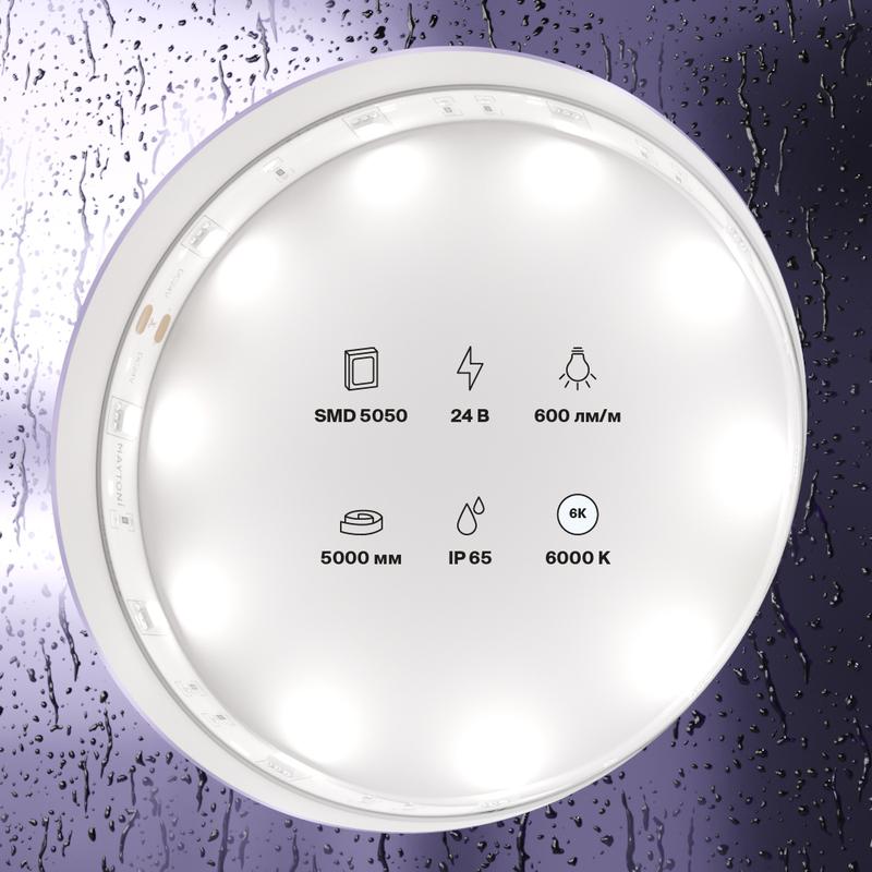 Основа ленты — яркие светодиоды SMD 5050 с нейтрально-белым свечением 6000K (дневной белый). Удельная мощность составляет 7.2 Вт на метр, что гарантирует высокую светоотдачу. Лента поставляется в бухте 5 метров, имеет степень защиты IP65, означающую полную защиту от пыли и защиту от струй воды с любого направления. Это делает ее пригодной для использования во влажных помещениях (ванные, кухни), для подсветки фасадов мебели, витрин, а также для уличного декоративного освещения в местах, защищенных от прямого попадания осадков.