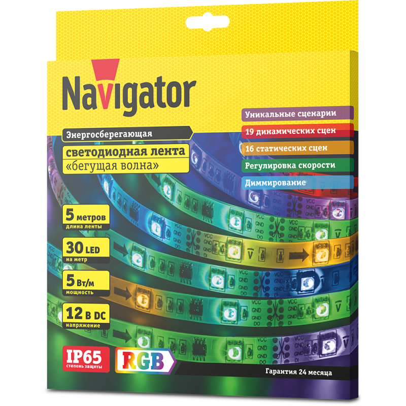 Лента светодиодная 71 834 NLS-5050RGBM30-5-IP65-12V "Бегущая волна" (уп.5м) Navigator 4670004718346 – средство освещения. Представляет собой полосу длиной 5 м, со светодиодами в количестве 30 шт./1 м, с длиной секции 50 мм. Самоклеющаяся, без адаптера подключения. Дает многоцветное освещение. Применяется в целях декоративного освещения и как способ оформления светодизайна помещений, витрин, фасадов, рекламных щитов и проч.