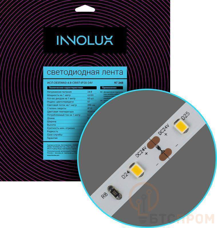Лента Innolux 97348 серии СДЛ-2835W60 с нейтральным белым светом и CRI97 предназначена для профессиональных задач, требующих точной цветопередачи. Напряжение 24В и мощность 4.8Вт/м создают идеальные условия для работы с цветом в полиграфии, дизайнерских студиях и медицинских учреждениях. Степень защиты IP20. Лента поставляется в бухте 5 метров. Требуется блок питания 24В. Innolux 97348 — это точность и надежность для профессионального использования.