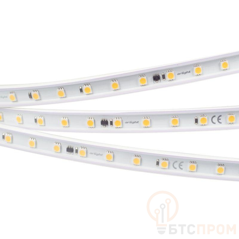 Светодиодная герметичная лента ARL серии B54, IP65 (PV - трубка, ПВХ экструзия). Светодиоды 5060, 54 шт/м, белая плата шириной 12 мм. Цвет ДНЕВНОЙ 4000K, индекс цветопередачи CRI>90, угол 120°. Питание 230 В, мощность 8 Вт/м (80 Вт на 10 м). Размеры 50000x15.5x6 мм. Мин. отрезок 500 мм, 27 светодиодов. Цена за 1 м. Светодиодная лента крепится с помощью скоб (приобретаются отдельно), 3M скотч отсутствует. Катушка 50 м.