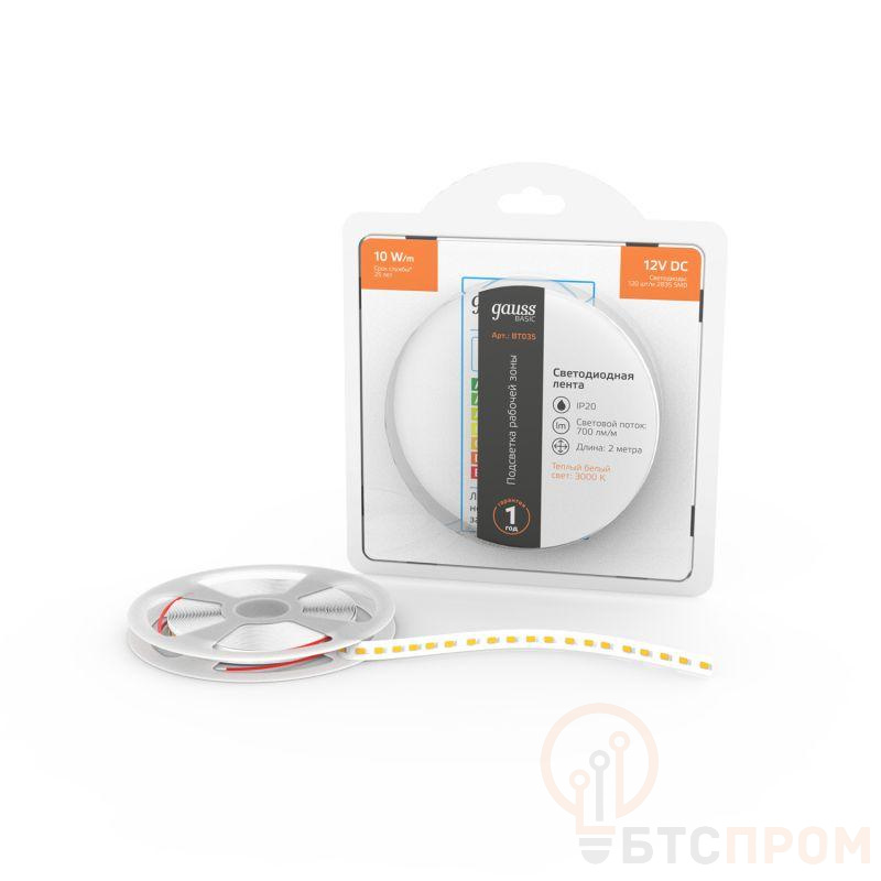 Лента светодиодная Basic 2835/120-SMD 10Вт/м 3000К тепл. бел. IP20 700лм/м 12В 8мм (уп.2м) GAUSS BT035