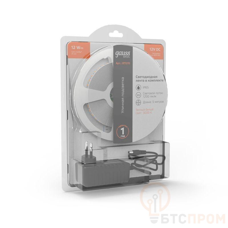 Лента светодиодная Basic 2835/120-SMD 12Вт 3000К тепл. бел. IP65 1200лм/м 12В 8мм драйвер (уп.5м) GAUSS BT070