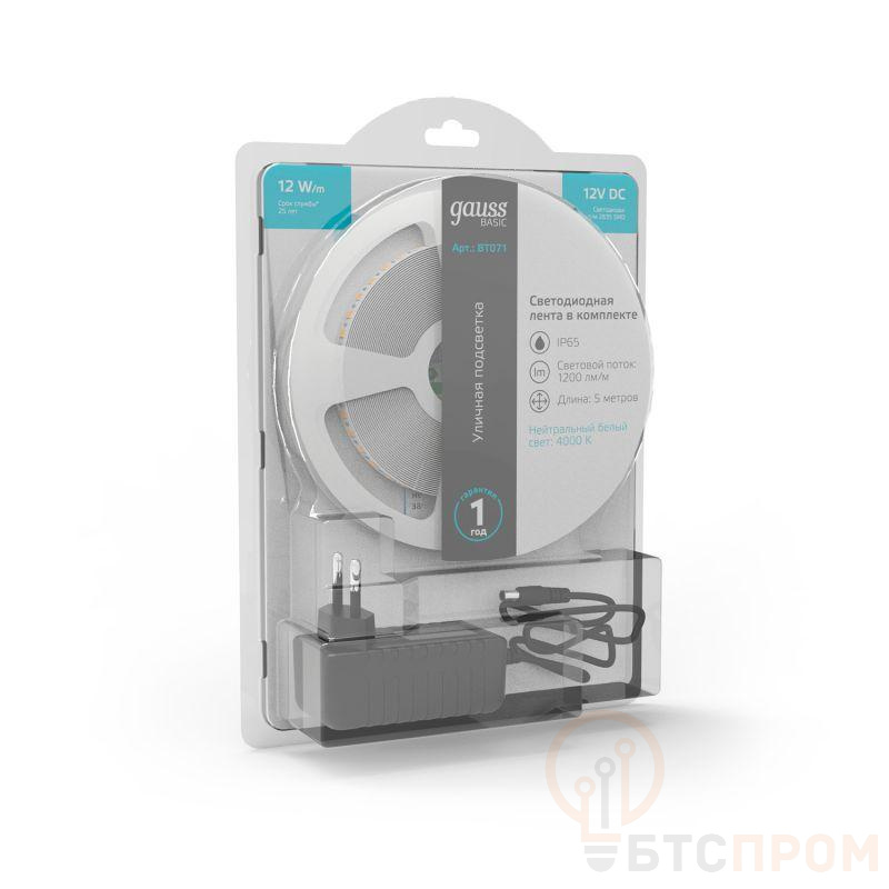 Лента светодиодная Basic 2835/120-SMD 12Вт 4000К нейтр. бел. IP65 1200лм/м 12В 8мм драйвер (уп.5м) GAUSS BT071