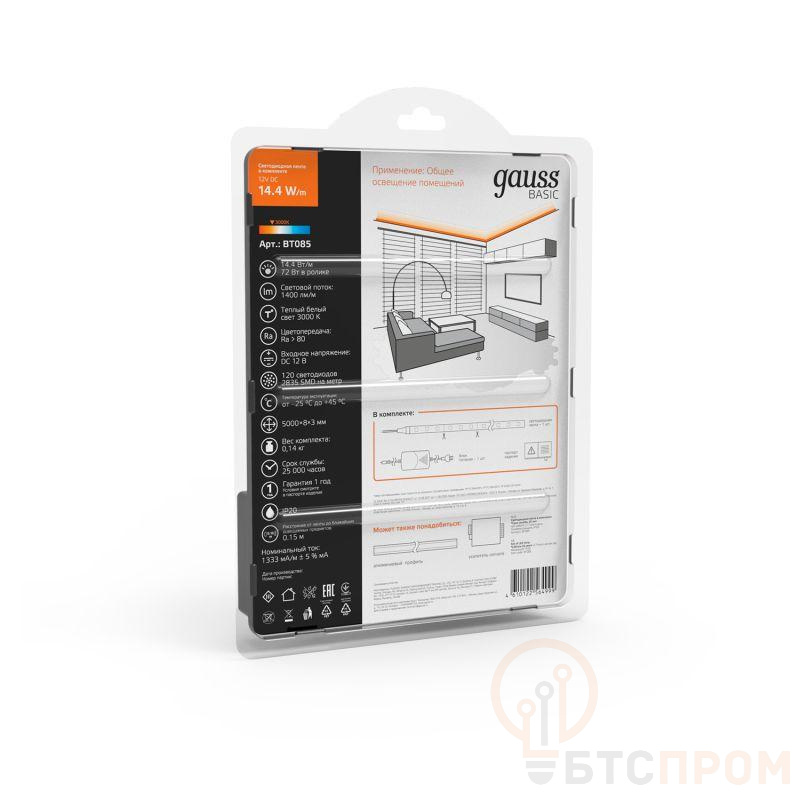 Лента светодиодная Basic 2835/120-SMD 14.4Вт/м 3000К тепл. бел. IP20 1400лм/м 12В 8мм драйвер (уп.5м) GAUSS BT085