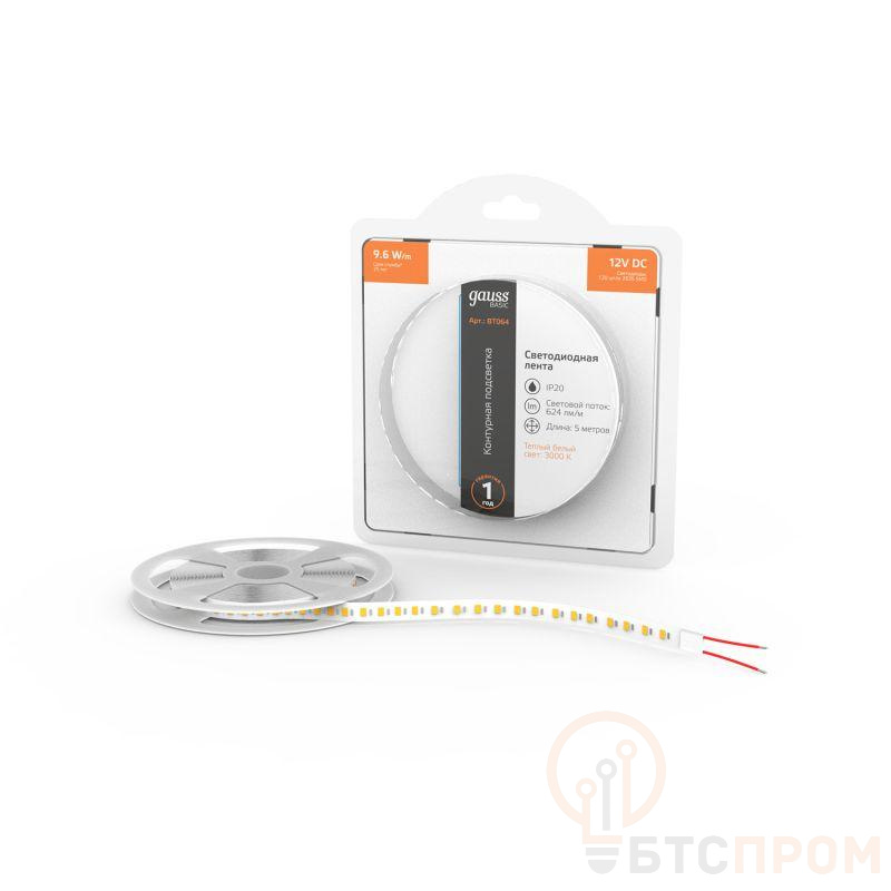 Лента светодиодная Basic 2835/120-SMD 9.6Вт/м 3000К тепл. бел. IP20 624лм/м 12В 8мм (уп.5м) GAUSS BT064