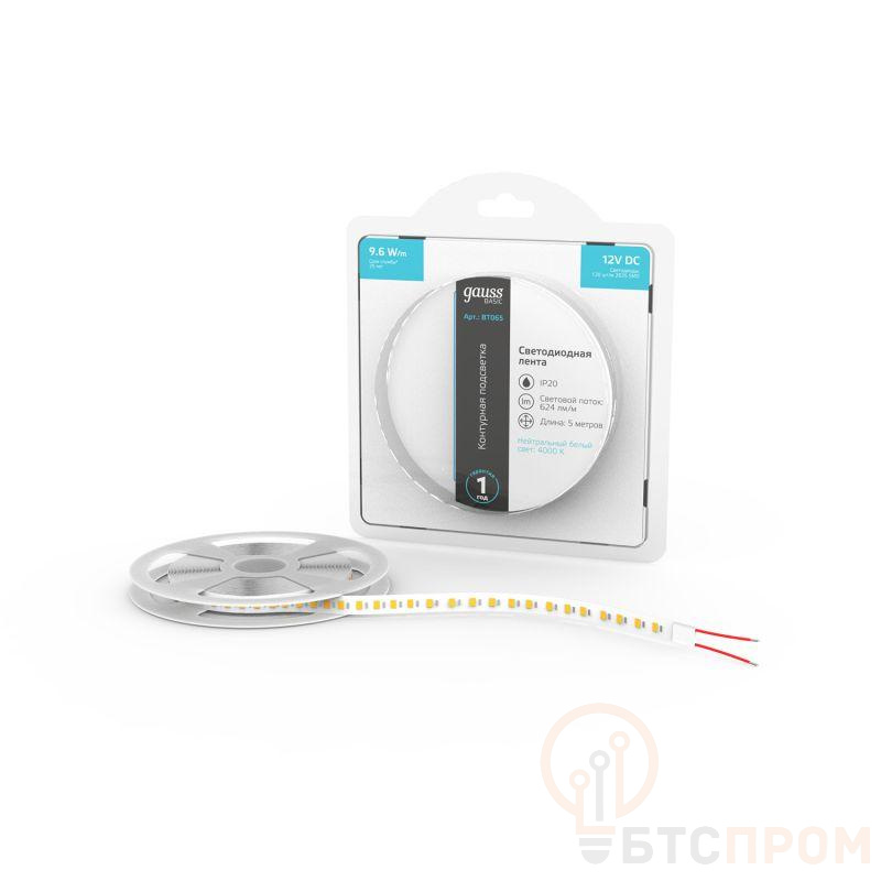 Лента светодиодная Basic 2835/120-SMD 9.6Вт/м 4000К нейтр. бел. IP20 624лм/м 12В 8мм (уп.5м) GAUSS BT065