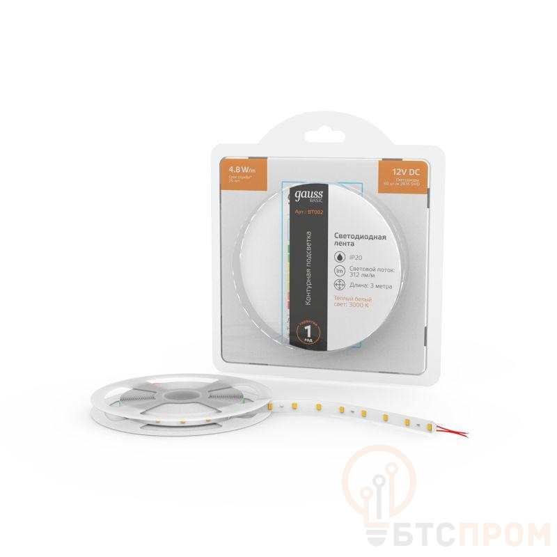 Лента светодиодная Basic 2835/60-SMD 4.8Вт/м 3000К тепл. бел. IP20 312лм/м 12В 8мм (уп.3м) GAUSS BT002