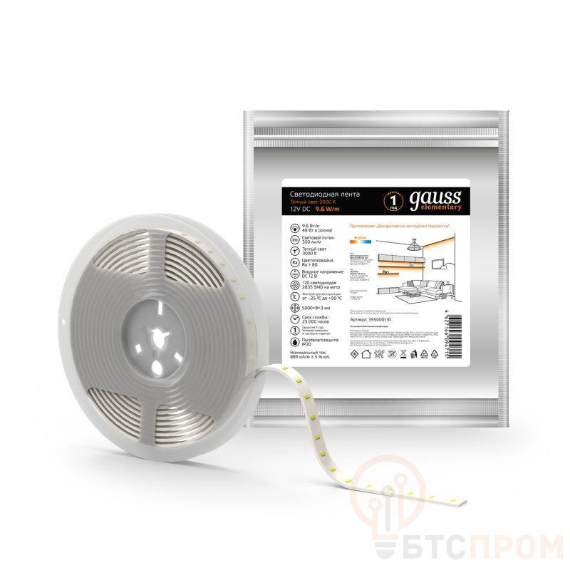 Лента светодиодная Elementary 2835/120-SMD 9.6Вт/м 3000К тепл. бел. IP20 340лм/м 12В 8мм (уп.5м) GAUSS 355000110