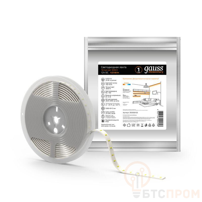 Лента светодиодная Elementary 2835/60-SMD 4.8Вт/м 3000К тепл. бел. IP20 170лм/м 12В 8мм (уп.5м) GAUSS 355000105