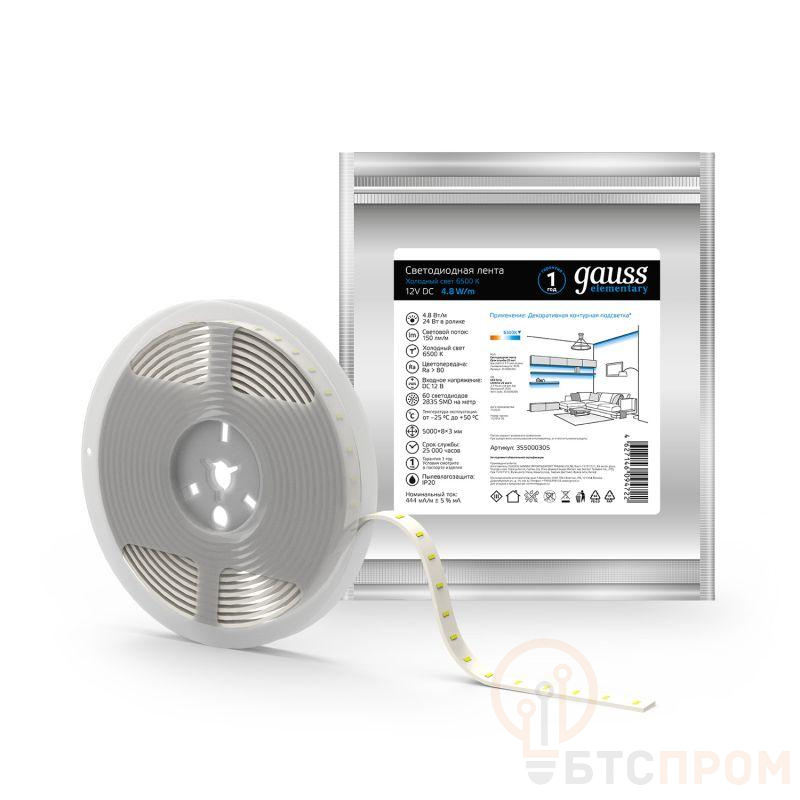 Лента светодиодная Elementary 2835/60-SMD 4.8Вт/м 6500К холод. бел. IP20 170лм/м 12В 8мм (уп.5м) GAUSS 355000305