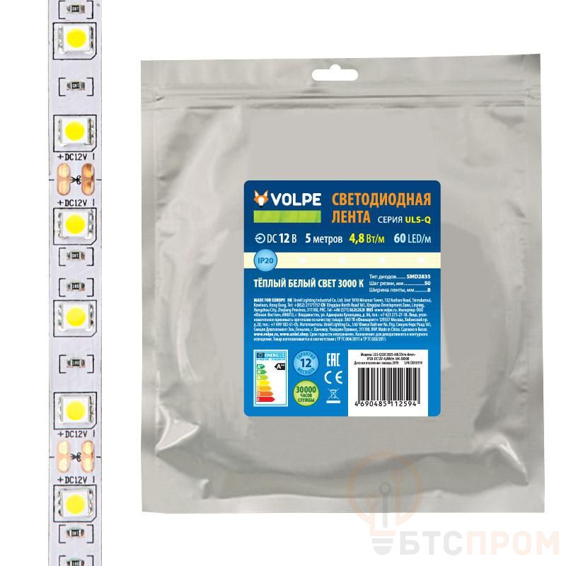 Лента светодиодная гибкая ULS-Q320 2835-60LED/m-8mm-IP20-DC12V-4.8Вт/m-5M-3000K на самоклеящейся основе (уп.5м) Volpe UL-00004538