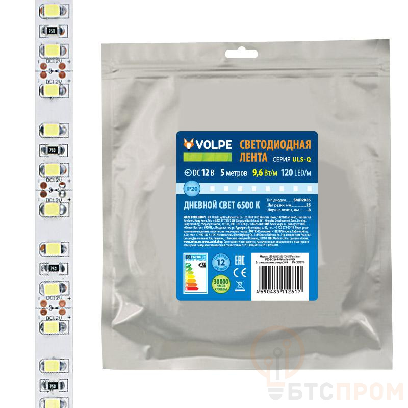 Яркая лента Volpe UL-00004539 ULS-Q330 2835-120LED/m-8mm-IP20-DC12V-9.6Вт/m-5M-6500K с холодным светом. Плотность 120LED/м дает интенсивный холодный белый свет (6500K). IP20. 12В DC. Ширина 8мм, самоклейка. Упаковка 5м. Для помещений, где требуется высокая освещенность и концентрация. Мощность 9.6Вт/м.
