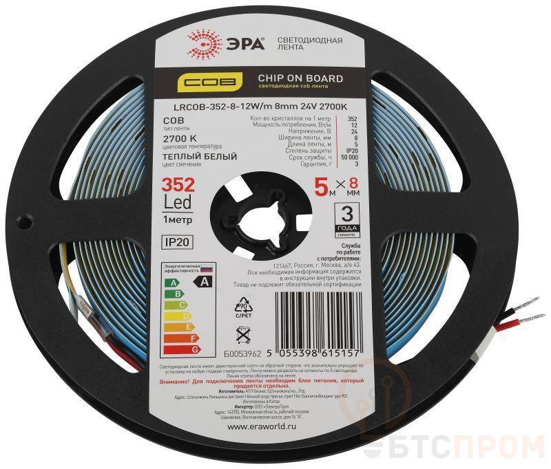 <p style="text-align:justify">Лента светодиодная ЭРА LRCOB-352-8 12W/m 8mm 24V 2700K 3year белая 5 м со степенью защиты от пыли и влаги IP20 - современный способ создания внутреннего освещения, подсветки ниш, лестничного пространства, систем хранения, а также декоративного и художественного оформления любых объектов и форм в помещениях. Светодиодная СОВ лента сплошной засветки без видимых светодиодов. Легко и быстро устанавливается на любой гладкой поверхности с помощью скотча, расположенного на оборотной стороне ленты Используя алюминиевый профиль, можно создавать необычные и функциональные решения освещения в Вашем интерьере. Рабочее напряжение ленты составляет 24В, а мощность равна 12 Вт/м. Светодиодная лента обладает световым потоком 1020 Лм/м, и цветом свечения - теплый белый (2700 K) <strong>ВНИМАНИЕ:</strong> - светодиодную ленту с напряжением 24В допустимо подключать последовательно отрезками не более 10 м. - для светодиодных лент с мощностью выше 9.6 Вт обязательно использование алюминиевого профиля для дополнительного охлаждения. Это существенно продлит срок службы светодиодной ленты. - во избежание выхода из строя не допускается длительная работа ленты в смотанном виде