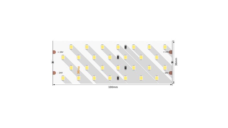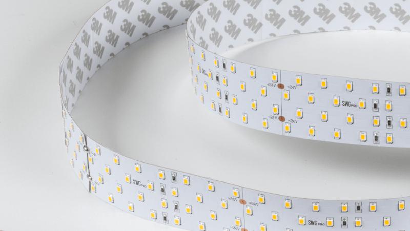Лента SWG PRO 00-00005601 2835 280 LED/м 26 Вт/м 24В IP20 тепл. бел. с предельной плотностью 280LED/м. Обеспечивает беспрецедентно равномерное и насыщенное теплое белое свечение (3000K). Это топовое решение для дизайнеров интерьеров, работающих с премиальными объектами: люксовые апартаменты, бутики, рестораны высокой кухни, лаунж-зоны, где свет должен быть безупречным. Напряжение 24В. Степень защиты IP20. Длина 5 метров. Мощность 26Вт/м требует использования алюминиевого монтажного профиля для обеспечения долговечности.