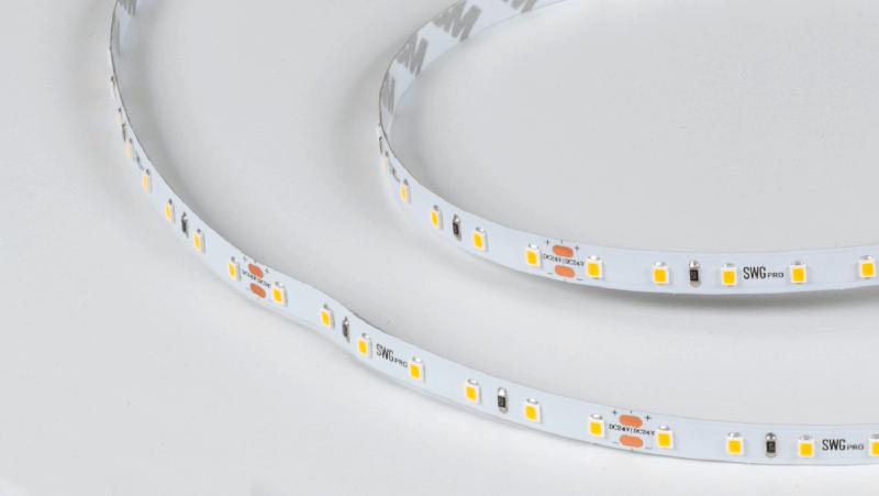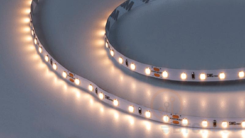 Светодиодная лента SWG PRO 00-00005850 2835 84LED/м 8.6Вт/м тепл. бел. 24В IP20 с плотностью 84LED/м. Обеспечивает приятное и равномерное теплое белое свечение (3000K), идеальное для создания уюта в жилых помещениях: подсветка телевизора, изголовья кровати, полок в гостиной. Напряжение 24В. IP20. Упаковка 5 метров. Энергопотребление 8.6Вт/м.