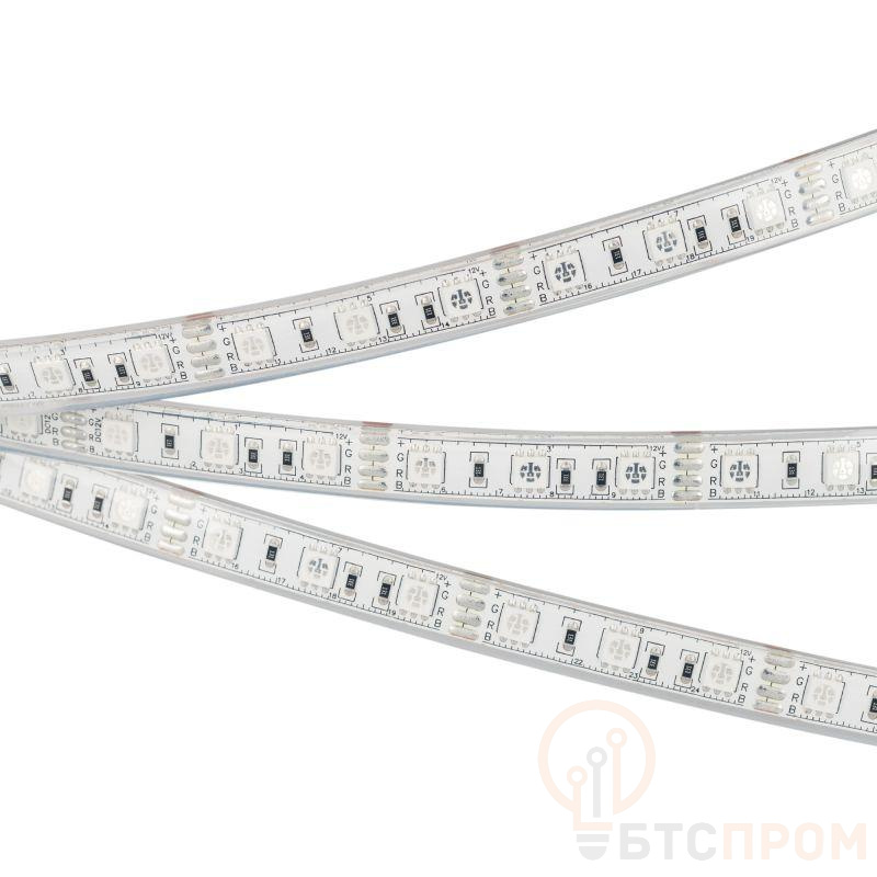 Мультицветная герметичная светодиодная лента RTW серии B60, IP68, PU - сплошной полиуретан. Светодиоды SMD 5060, 60 шт/м, белая плата шириной 10 мм, крепление на скобы, 2-метровый кабель для подключения. Цвет RGB. Питание 12 В, мощность 14.4 Вт/м (72 Вт на 5 м), угол 120°. Размеры 5000x12.5x5.6 мм. Мин. отрезок 50 мм, 3 светодиода. Цена за 1 м.