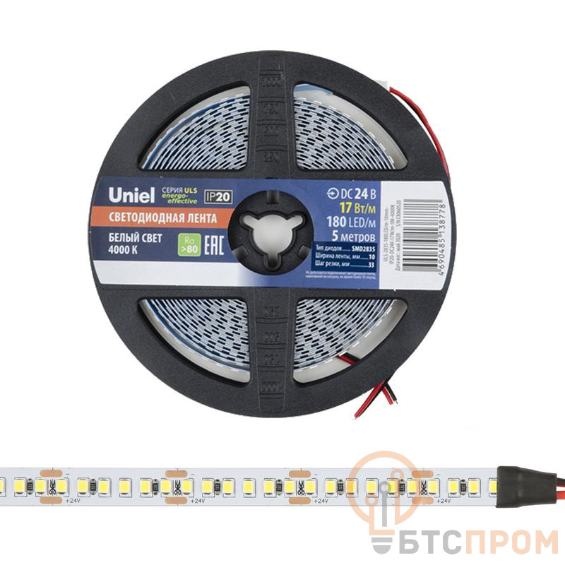 Лента светодиодная ULS-2835-180LED/m-10mm-IP20-DC24V-17W/m-5M-4000K 17Вт/м 180LED/м 4000К нейтр. бел. IP20 24В DC 10мм гибкая на самоклеящейся основе герметичн. упак. (уп.5м) Uniel UL-00007643
