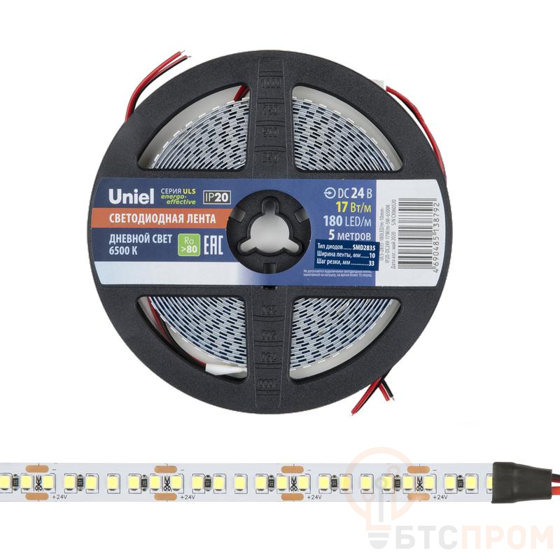 Лента светодиодная ULS-2835-180LED/m-10mm-IP20-DC24V-17W/m-5M-6500K 17Вт/м 180LED/м 6500К холод. бел. IP20 24В DC 10мм гибкая на самоклеящейся основе герметичн. упак. (уп.5м) Uniel UL-00007644