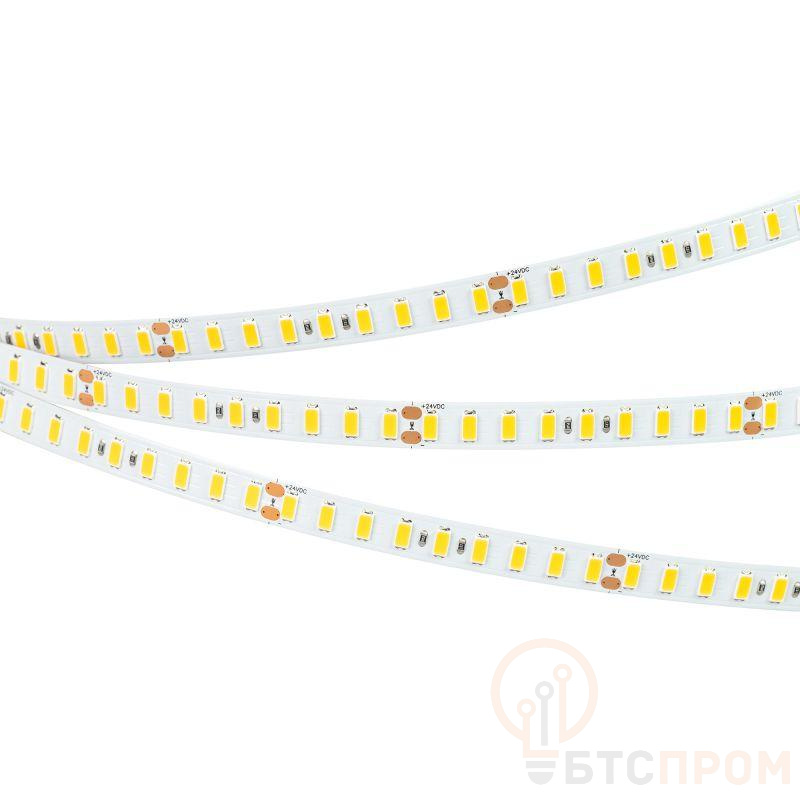 Светодиодная высокоэффективная лента ULTRA серии C126. Светодиоды SMD 5630, 126 шт/м, белая плата шириной 10 мм, скотч 3M. Цвет ТЕПЛЫЙ 2700K, высокая световая эффективность 200 лм/Вт, индекс цветопередачи CRI>80, угол 120°. Питание 24 В, мощность 14.4 Вт/м (72 Вт на 5 м). Размеры 5000x10x1.4 мм. Мин. отрезок 71.4 мм, 9 светодиодов. Цена за 1 м. Рекомендуется установка на профиль.