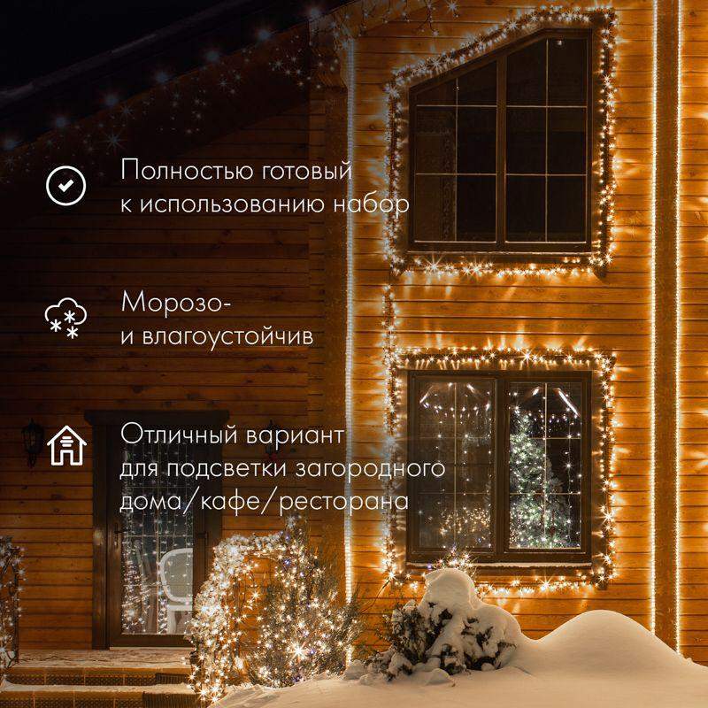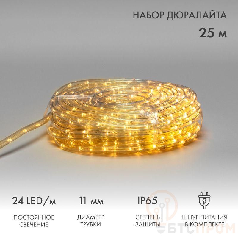 Дюралайт LED теплого белого свечения – это прозрачная герметичная трубка из ПВХ, внутри которой расположены яркие светодиоды – 24 элемента на 1 метр длины. Благодаря герметизации по стандарту IP65, изделие защищено от проникновения пыли и влаги – может использоваться как в помещении, так и на улице. Набор состоит из 25 метров дюралайта, укомплектованного кабелем с диодным мостом и заглушкой.