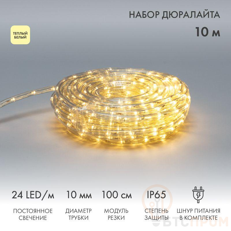 Дюралайт LED теплого белого свечения – это прозрачная герметичная трубка из ПВХ, внутри которой расположены яркие светодиоды – 24 элемента на 1 метр длины. Благодаря герметизации по стандарту IP65, изделие защищено от проникновения пыли и влаги – может использоваться как в помещении, так и на улице. В наборе 10-метровый дюралайт, питающий кабель с диодным мостом. Модуль резки изделия 1 метр.