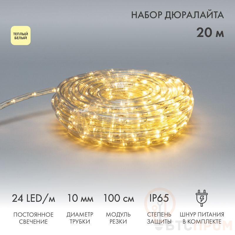 Дюралайт LED теплого белого свечения – это прозрачная герметичная трубка из ПВХ, внутри которой расположены яркие светодиоды – 24 элемента на 1 метр длины. Благодаря герметизации по стандарту IP65, изделие защищено от проникновения пыли и влаги – может использоваться как в помещении, так и на улице. В наборе 20-метровый дюралайт, питающий кабель с диодным мостом. Модуль резки изделия 1 метр.