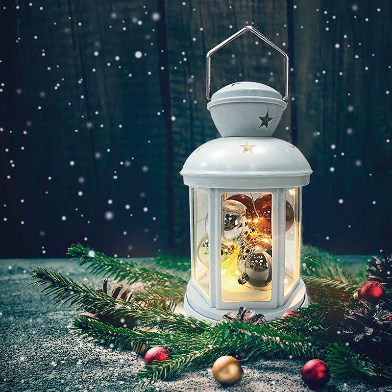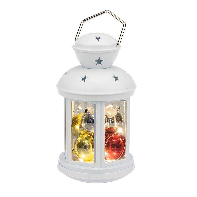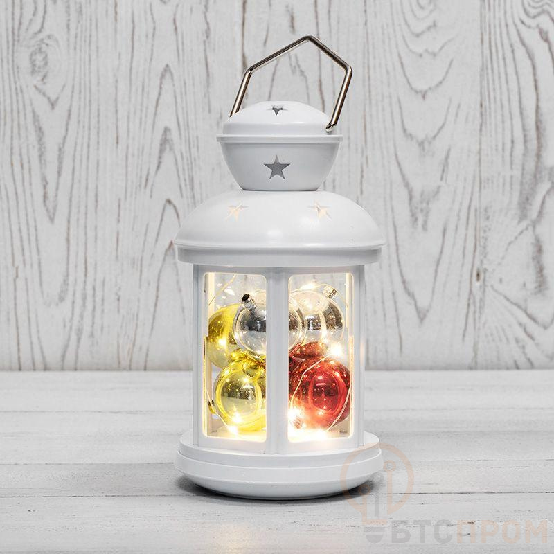 Декоративный фонарь представляет собой корпус белого цвета аутентичного исполнения, за стеклом находятся небольшие елочные шарики, подсвечиваемые диодной мини-гирляндой. 12 диодов излучают теплый белый свет и питаются от 2 батареек типа АА. Металлизированная глянцевая поверхность шариков эффектно играет в световом потоке, отбрасывая яркие блики на окружающие предметы. Светодиоды экономичны, безопасны и долговечны. Фонарь с шариками станет великолепным украшением праздничного и повседневного интерьера.