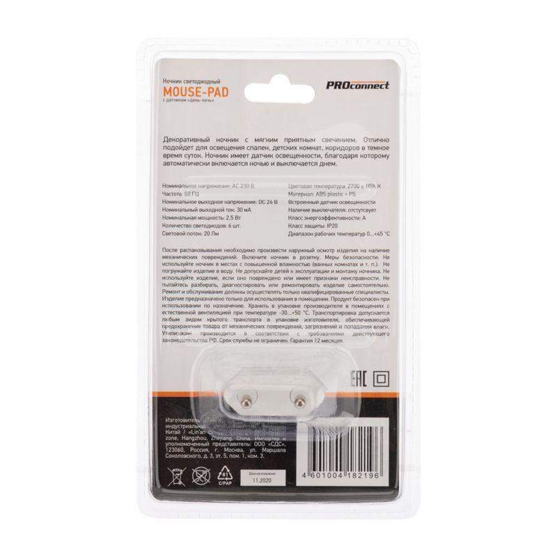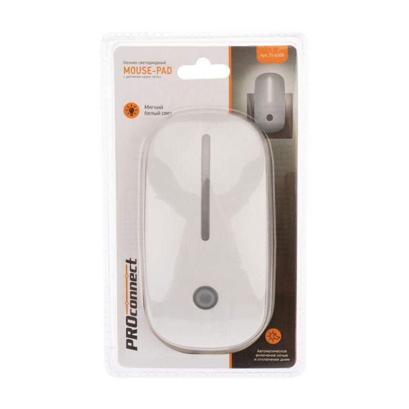 Ночник светодиодный MOUSE-PAD с датчиком "день-ночь" бел. 230В PROCONNECT 75-0308 — это ночник в форме коврика для мыши, который подключается непосредственно к розетке 230В. Он оснащен датчиком освещенности ("день-ночь"), который автоматически включает свет в темноте и выключает его при наступлении дня. Это обеспечивает полную автономность работы и экономию электроэнергии. Форма "мауспада" делает его удобным для размещения на полу в коридоре, детской комнате или у кровати, чтобы мягко подсветить путь ночью. Белый цвет корпуса. PROCONNECT предлагает простое и надежное решение для автоматического ночного освещения.