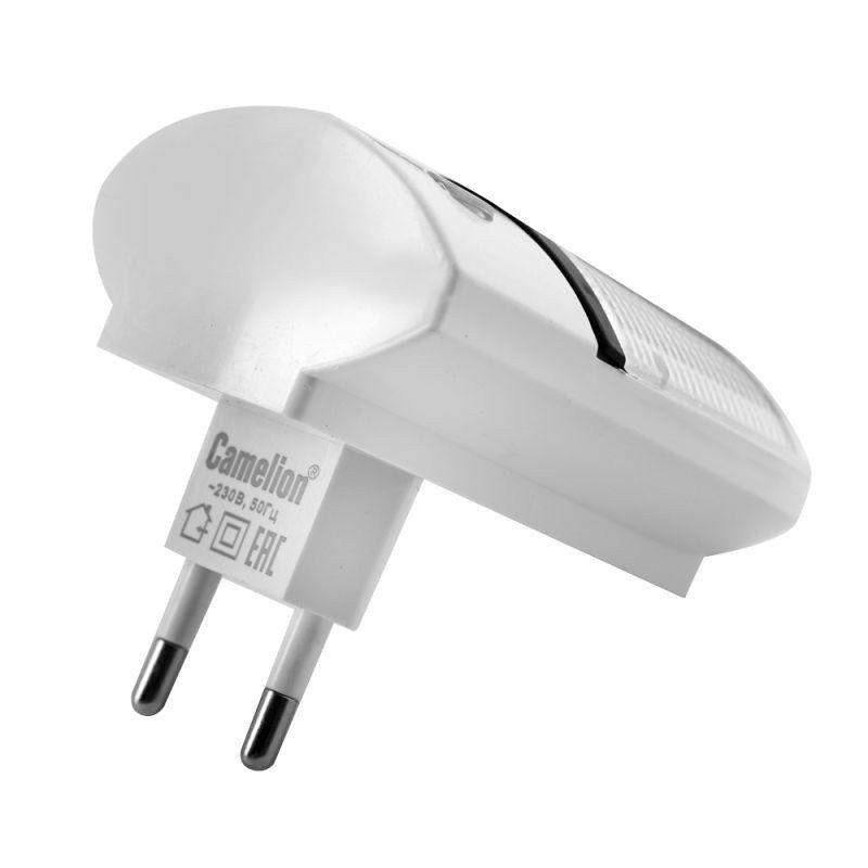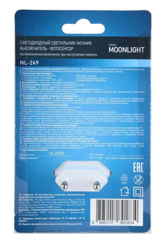 Светильник ночник предназначен для локальной подсветки в детских комнатах, спальнях, гостиных. Camelion NL-249 "фотосенсор", питание от сети 220В, размеры 90*60*60мм, источник света - встроенные светодиоды, выключатель на корпусе, пластик