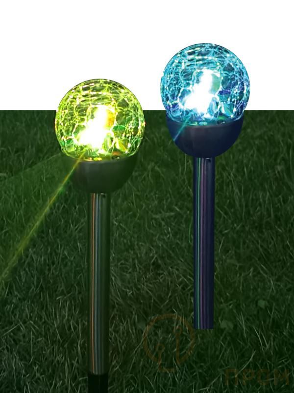 Садовый светильник в форме шара из битого стекла переливается разными цветами. Выполнен из нержавеющей стали. Светильник заряжается от солнца днем и автоматически включается ночью с помощью датчика света. При максимальной зарядке светильник на солнечной батарее способен непрерывно светить до 8 часов. Аккумулятор: АА Ni-Mh, 200 мАч. 2 светильника в одной упаковке