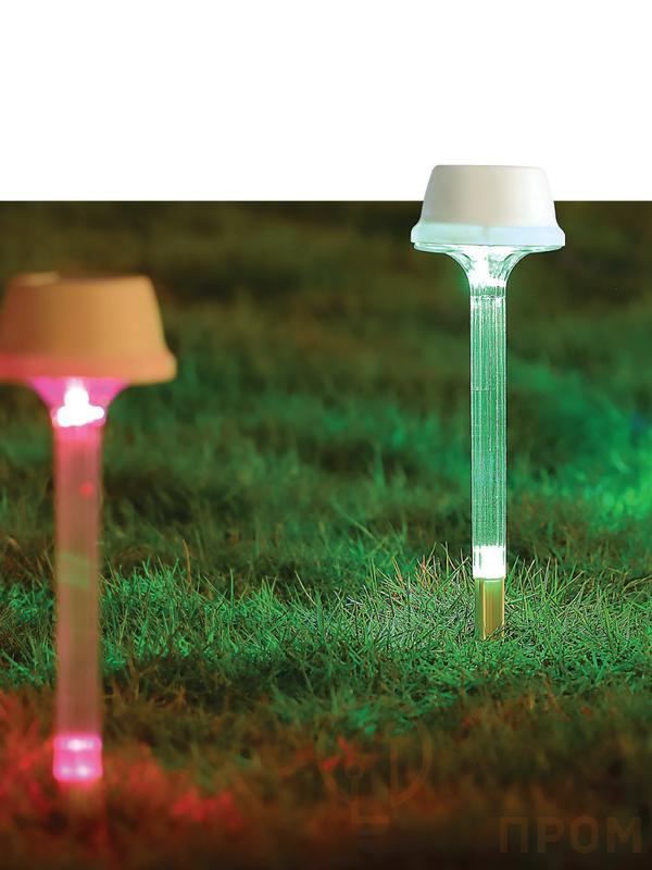 Светильник уличный на на солнечной батарее. Цвет свечения - мультиколор. Супер яркий светодиод. Аккумулятор ААА NI-MH 100мАч, Заряжается от солнечного света, включается автоматически с наступлением темноты. Время непрерывной работы при полностью заряженном аккумуляторе - 8 часов. 2 светильника в одной упаковке