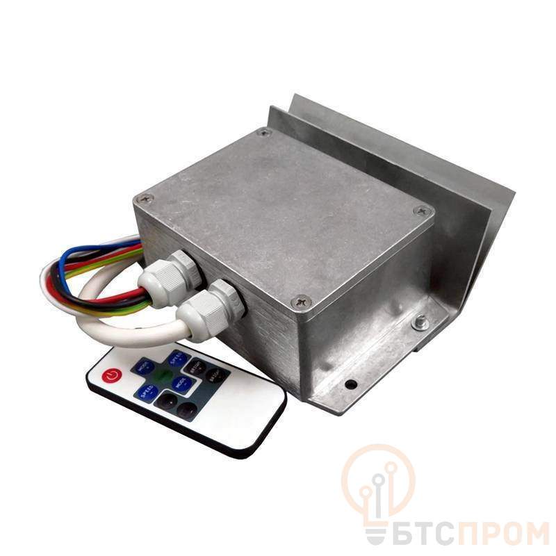 Контроллер выполнен в алюминиевом влагозащищенном корпусе с фланцами для крепления. Управление контроллером осуществляется с пульта ДУ на радиолучах. Дальность приема до 10 м прямой видимости.
