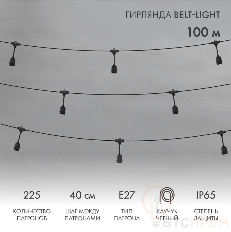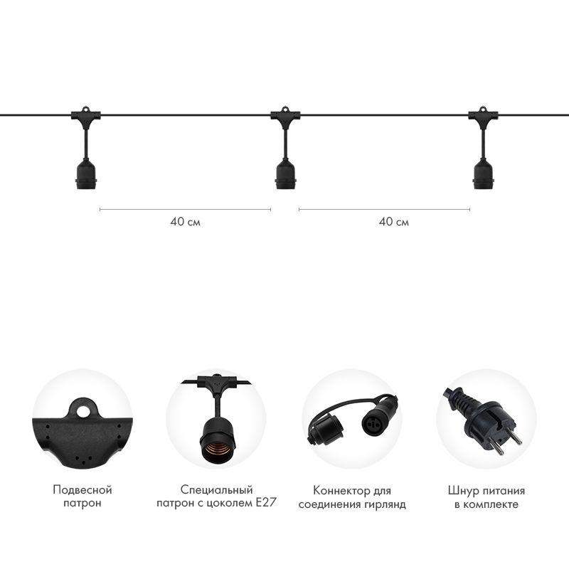 Гирлянда "Белт Лайт" - это профессиональное осветительное решение для наружного применения. Конструкция состоит из двухжильного кабеля с шагом расположения патронов 40 см, что обеспечивает равномерное распределение света. Подвесные влагозащищенные патроны E27 позволяют использовать лампы общей мощностью до 1320 Вт.
