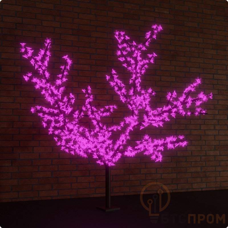 Светодиодное дерево «Сакура» высотой 3,6 метра излучает мягкий фиолетовый свет, который эффектно выделяет декоративные цветы на изящных ветках. Ствол и крона выполнены из ПВХ черного цвета. Диаметр композиции в самом широком месте составляет 3 метра. Для размещения на ровных поверхностях предусмотрена металлическая подставка с отверстиями для крепежа, анкерные болты надежно фиксируют конструкцию. Защита IP65 предполагает использование как в помещениях, так и на улице. Светодиодное дерево питается от сети 230 Вольт, понижающий адаптер идет в комплекте.