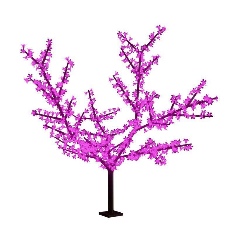 Светодиодное дерево «Сакура» высотой 2,4 метра с защитой IP65 — оригинальный, эффектный декор, который станет великолепным украшением интерьера или экстерьера. Раскидистая крона со множеством прозрачных пластиковых цветов достигает диаметра 2 метра. Внутри каждого элемента находится энергоэффективный безопасный диод фиолетового свечения — всего 1728 элементов. Ствол и ветви выполнены из черного ПВХ. Дерево имеет сборную конструкцию, которая легко монтируется. Для размещения на ровной поверхности предусмотрена металлическая подставка с отверстиями под анкерный крепеж.