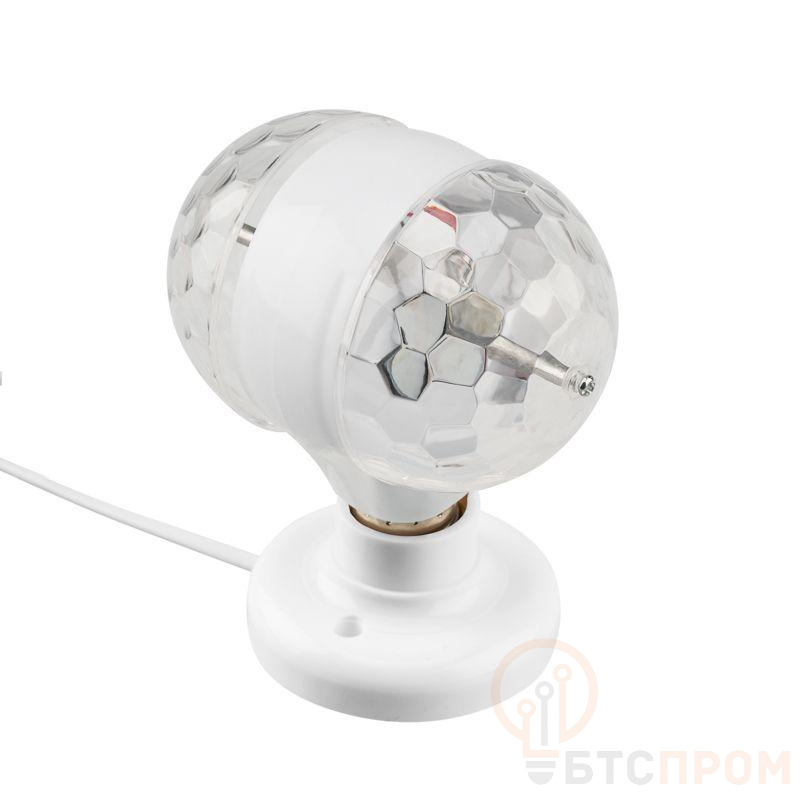 Двойная диско-лампа с цоколем Е27 и подставкой поможет организовать веселую вечеринку где угодно благодаря эффектной светомузыке, которую создают 2 вращающихся модуля со светодиодами RGB. 6 диодов «мультиколор» светятся разноцветными огнями, а вращающиеся купола разносят поток ярких лучей, имитируя работу настоящих диско-систем. Лампу можно вкрутить в люстру, настенный светильник или торшер с подходящим патроном. В комплекте идет настольная подставка, которая подключается к электросети.