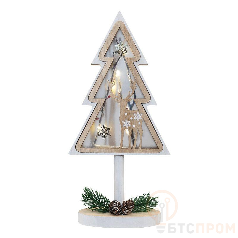 Деревянная фигурка с подсветкой «Елка на подставке» 14,5?5?30 см — оригинальный интерьерный декор, созданный, чтобы дарить тепло и ощущение уюта. В основе композиции находится фигура елочки с резным дополнением в виде оленя. Матовую поверхность украшают расписные снежинки, на подставке расположены хвойные веточки с двумя шишками — главные атрибуты зимних праздников. Деревянная фигурка с подсветкой работает от 1 батарейки типа CR2032, предназначена для использования в отапливаемых помещениях с умеренной влажностью.
