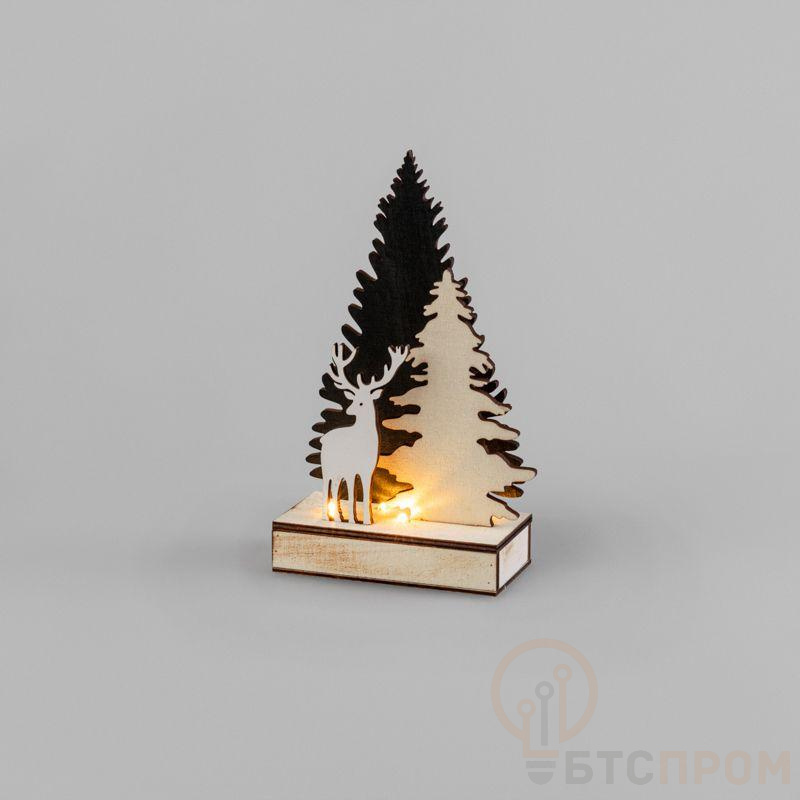 Деревянная фигурка с подсветкой «Елочка с оленем» 12?6?21,5 см станет прекрасным подарком для ваших друзей и близких к любому празднику. Оригинальный интерьерный декор представляет собой композицию из трех фигур: двух резных елей и оленя. Листовая древесина с характерной фактурой — экологичный материал, который понравится любителям аутентичных украшений. 4 безопасных светодиода излучают теплый белый свет и не нагревают основу. Питание осуществляется при помощи 2 батареек типа ААА — декор не зависит от розетки.